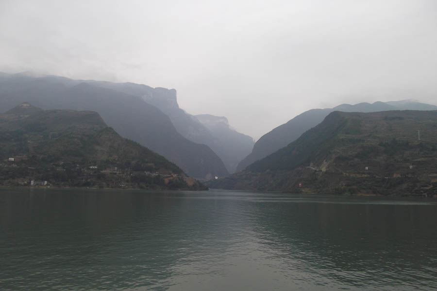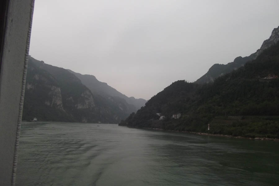 Back on the ship I had to fix my camera – it turned out that the White Elephant batteries we’d bought locally could run out rather abruptly with no warning – so I was late down for lunch. I had to take dessert up to the coffee lounge to admire the Wu and Qutang Gorges as we passed through them. There was a standing stone sacred to the Goddess at the entrance, and dragons in the hills.