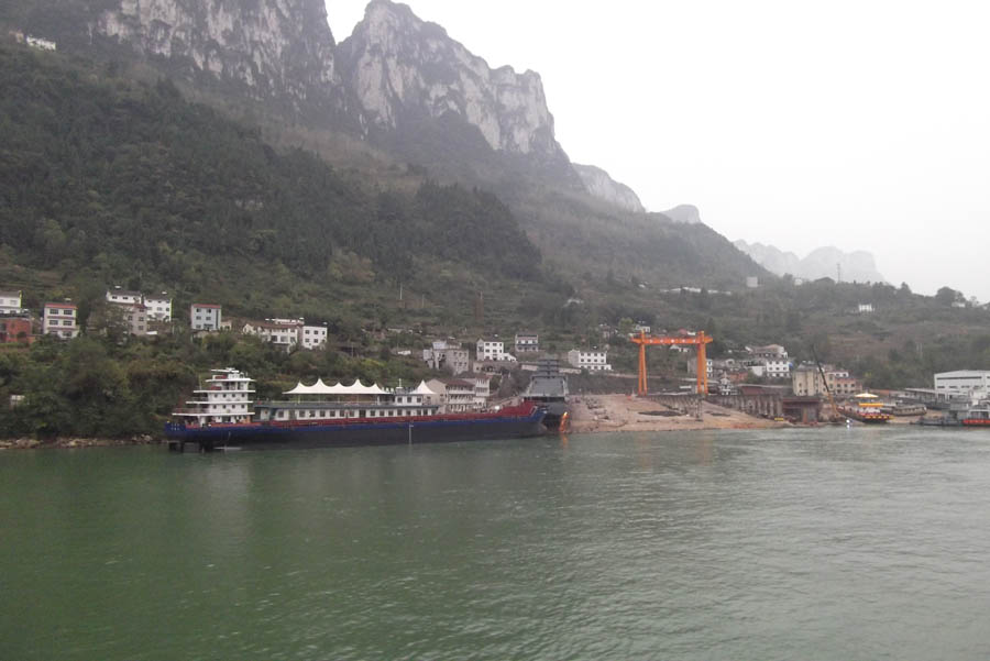 Building this steel/concrete gravity dam, long planned, was finally started in 1994 and completed in 2012. The ship locks and lift were finished later; our vessel was too large to go up in the incredible ship lift itself. The dam is 1.2 kilometres across and creates a reservoir 600 kilometres long, reaching all the way to Chongqing. Its output is 22.5 megawatts; half the average UK power demand.
