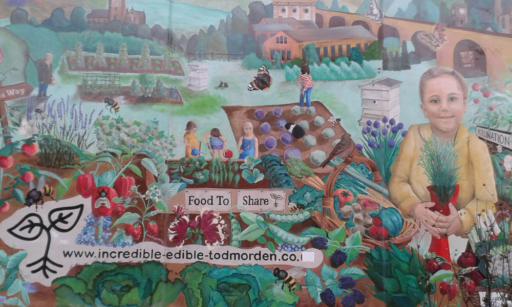 I met up with Estelle Brown from Incredible Edible Todmorden at lunchtime for a quick tour of their edible landmarks. The medicinal herb beds beside the canal had survived inundation, though nearby buildings had suffered badly. Pollinators’ Avenue, originally a temporary installation, was still going. The locals were fending off a planned retail centre on the site, having a perfectly good market next door.
