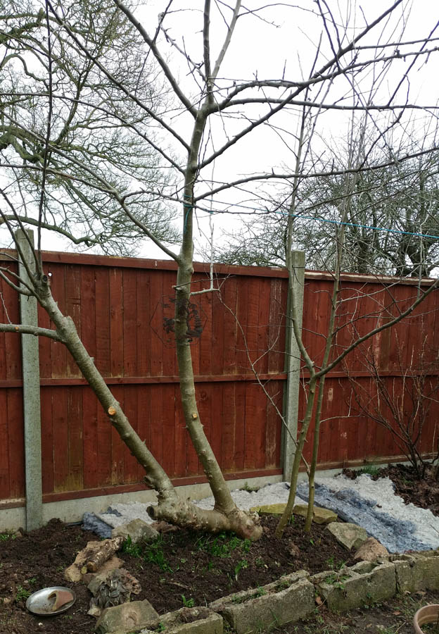 This is the apple tree in the Resilience Garden. It grew from an apple core hidden in a plant pot by my daughter. Although it produces good red eating apples, it clearly wants to be a very large tree. It’s an example of very bad pruning; I tried to make a ‘goblet’ shape without taking into account the shading from the fence behind. After that, I appreciated the courses more.