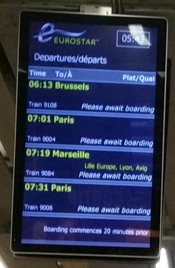 It was much cooler the next morning at 5 o’clock when I headed for St Pancras International. The check in for the Eurostar resembles that for air travel; you’re advised to start the process an hour before departure. Although manual check-in was quiet at this time of day, it had been quite crowded the previous afternoon.