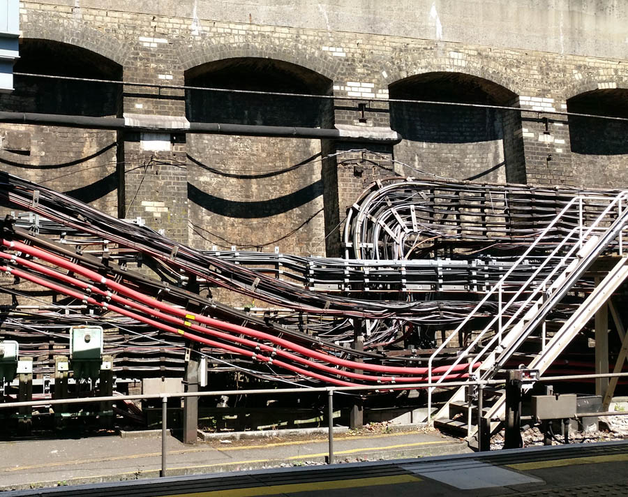 I had to go to Bristol tiresomely early, and got on a very crowded train to London Paddington. However, as part of the research for my adventure, I’d read ‘Infrastructure‘ by Brian Hayes, and was soon diverted by observing the complicated arrangements of wires, poles and boxes whose functions I was learning.