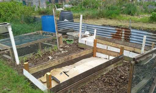 The leaf mould mulch has run out now; we don’t want to use straw in case it combines with the clay to make bricks!  We’re building temporary raised beds, using the wood from the neighbour’s old shed.  These are getting filled with free manure and topped with a thin layer of bought compost.  In the winter, when the soil is soft again, we’ll dismantle the beds and dig this in; now, we’ll raise a catch crop in them.