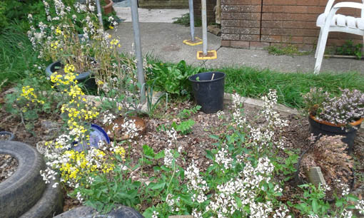 Beans, garlic and courgettes do well, and the raised beds used clean soil imported from the Resilience Garden so the potato crop was small but healthy. Due to years of selective weeding, this soil is full of seeds from edible plants. Left unattended for awhile, borage, marigold, rocket and spinach flourish. Unlike the perennial weeds they replace, these plants can be pulled up easily and composted.